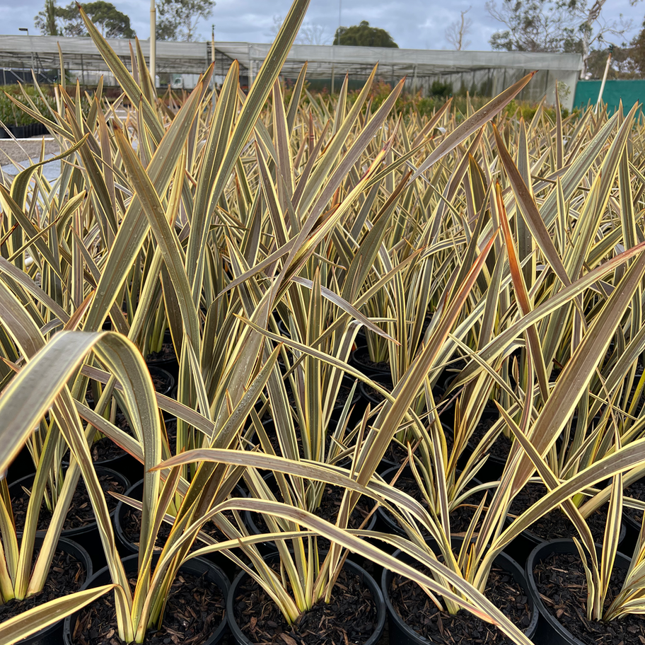 Phormium ‘Hawthorn’ is a striking, mid-sized New Zealand Flax variety featuring long, upright leaves in a sophisticated blend of olive green and cream. Its sword-like, variegated foliage forms a tidy, fountain-like clump that brings structure, texture, and year-round colour to the garden.